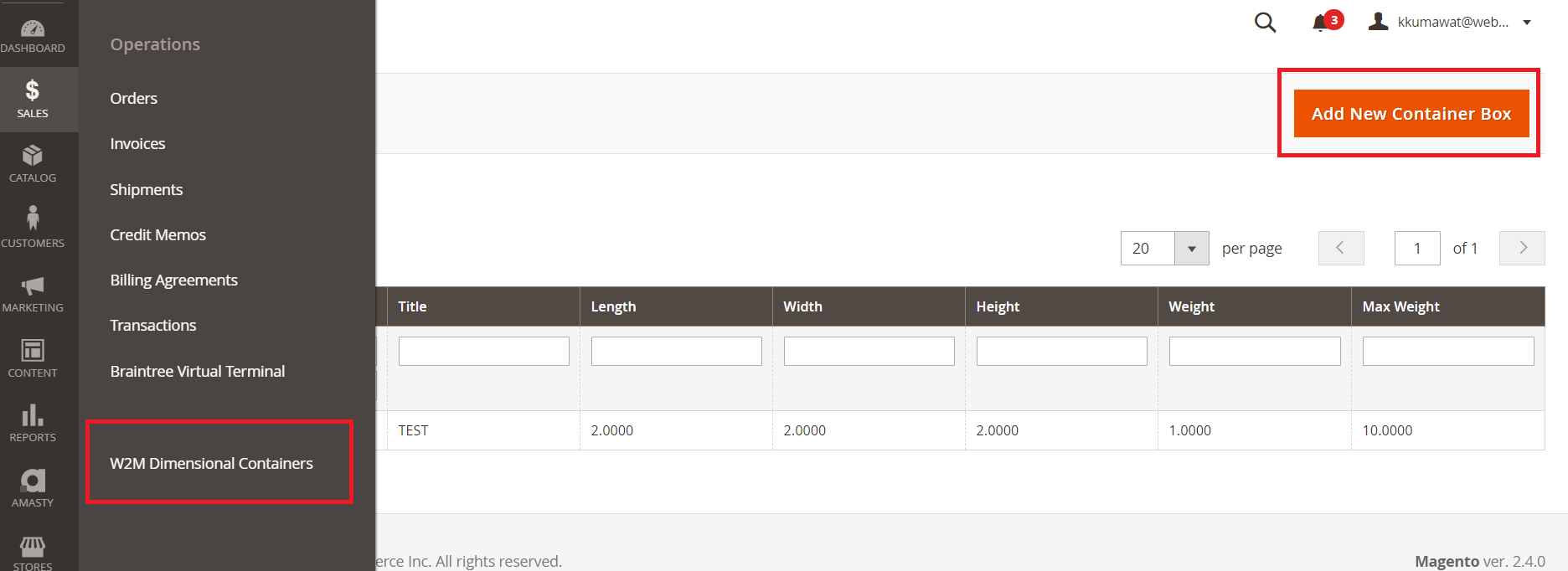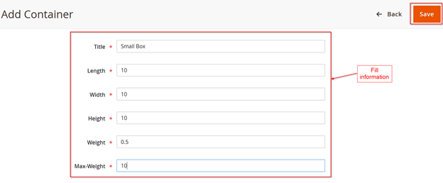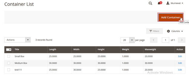 Ans: You need to create containers to ship the products in the Sales-> Dimensional Container option in admin. The extension will collect all the container data available (created by you) and collect all the product dimensions from the cart and then it will calculate the dimensions to find a best-fit container for the products.