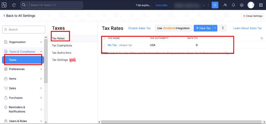 - Create a 0% Tax Rate: Go to "Settings" -> "Taxes" -> "Tax Rates" and click the "+ New Tax" button to create your first tax rate at 0%.